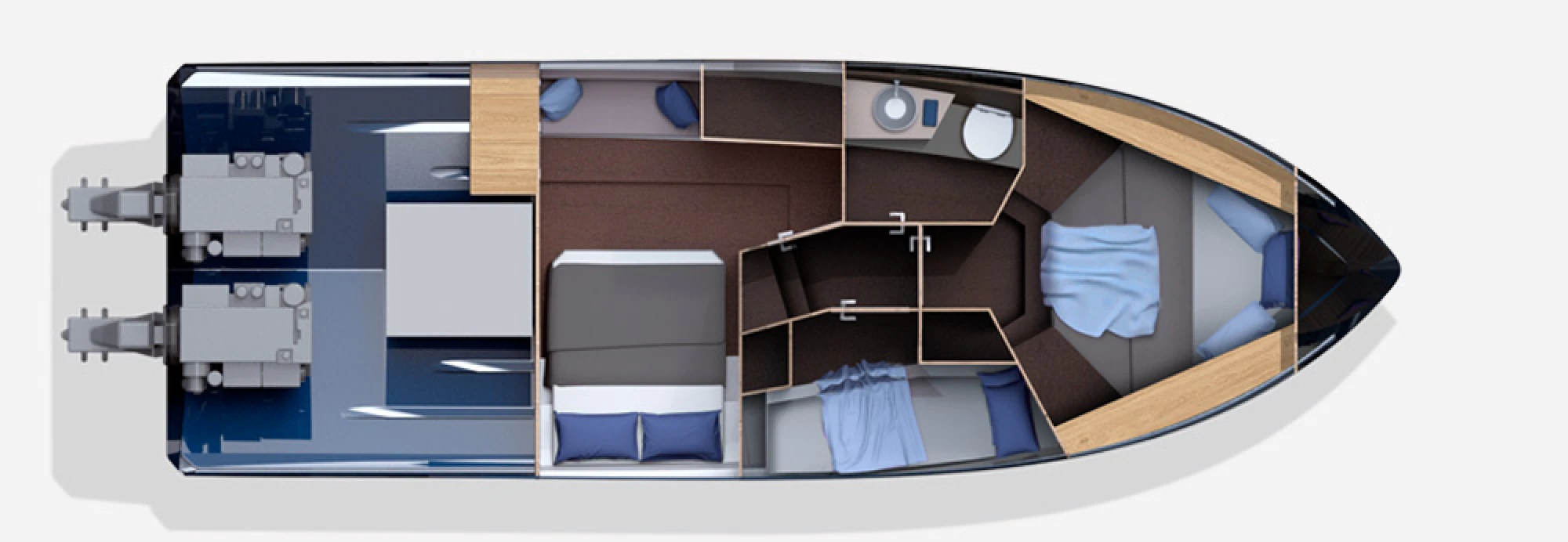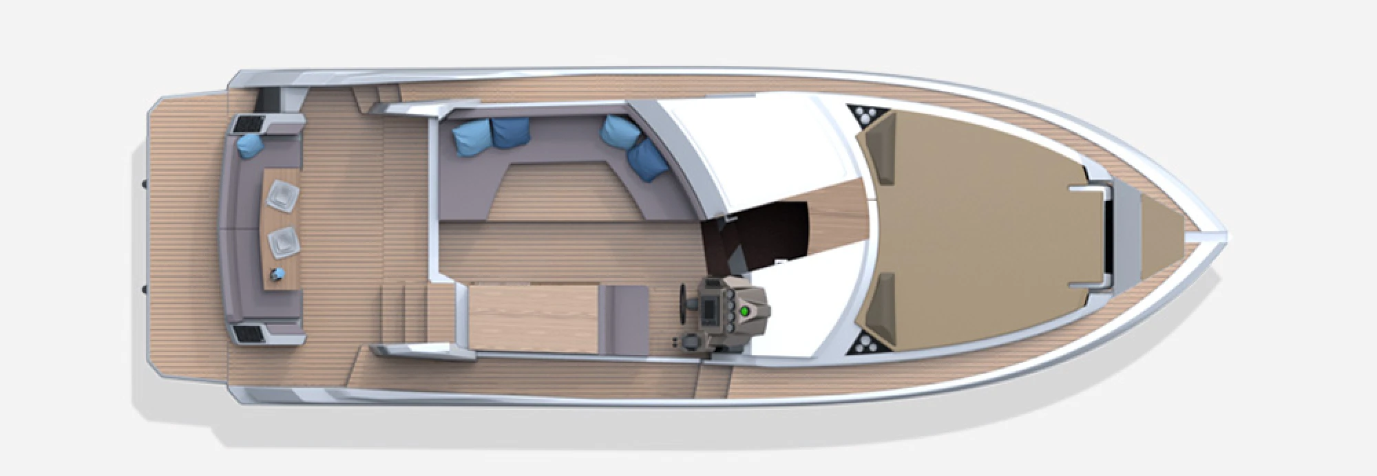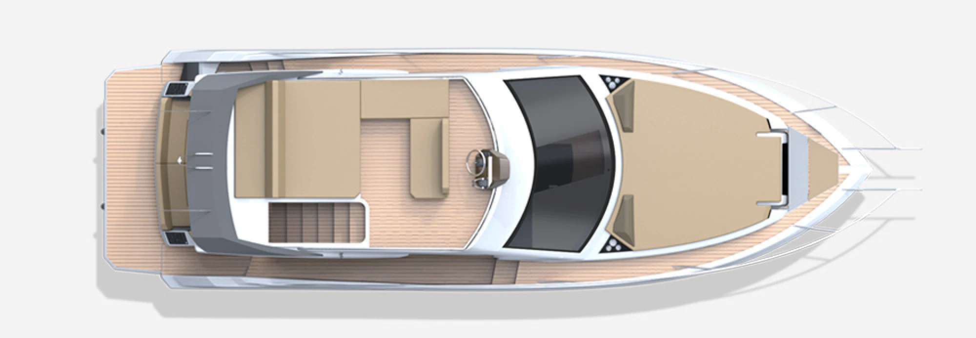 An L-shaped sofa nestled in the cockpit area allows comfort inside, with steps leading up to the flybridge, where the double driver’s seat and leisure area for guests can be found. The bow sundecks make for an ideal spot for sunbathing and thrill rides.