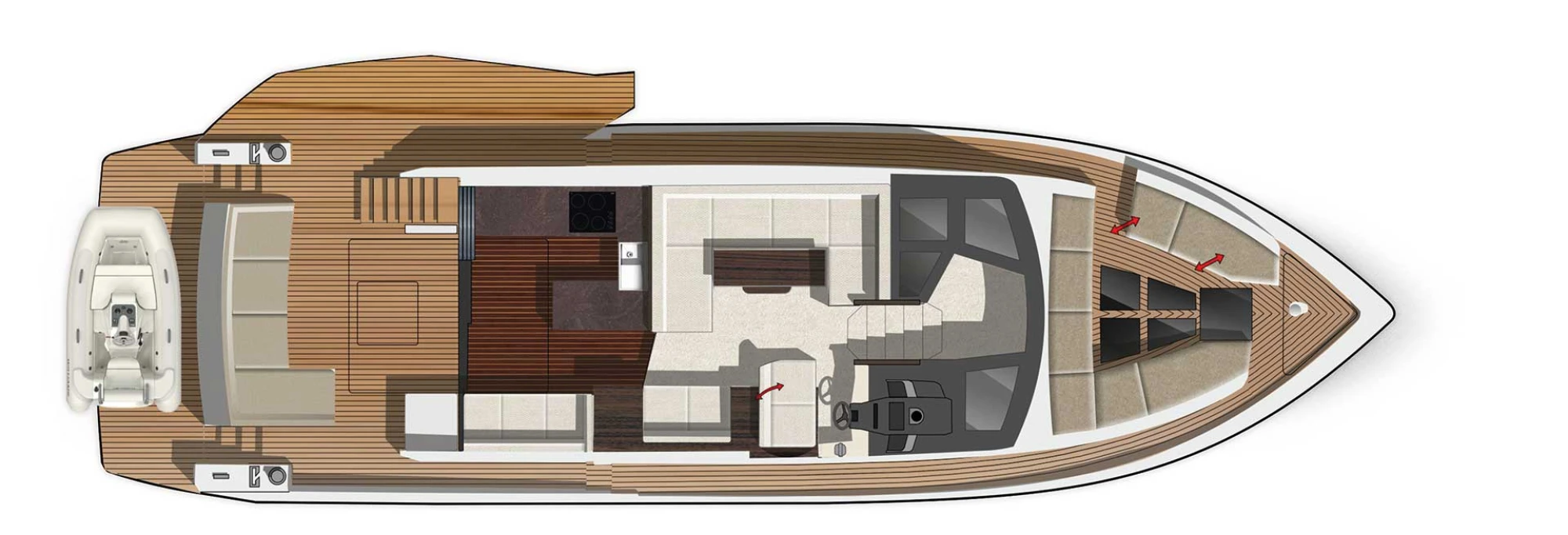 The flybridge features a glass sunroof over the helm station, sundecks, and a helm station with a soft roof. Aft is a hydraulic tender garage with rotating seat and a grill area. The 510 SKY also features Beach Mode, which extends the cockpit to an impressive six metres with fold-out balconies, sliding windows, and a convertible bar area.