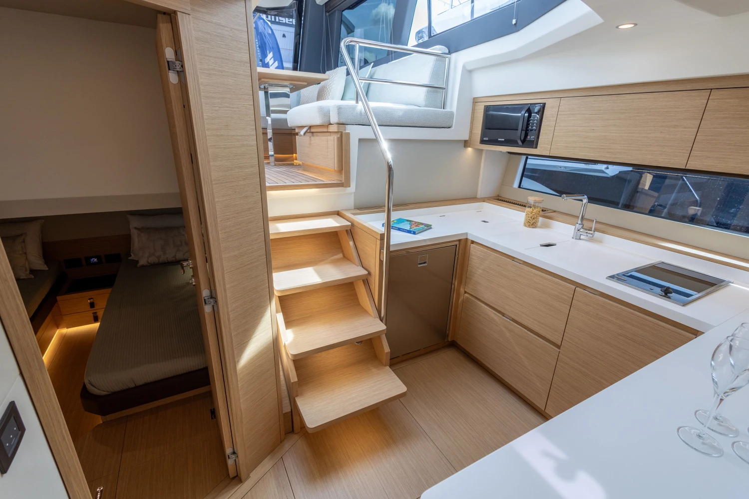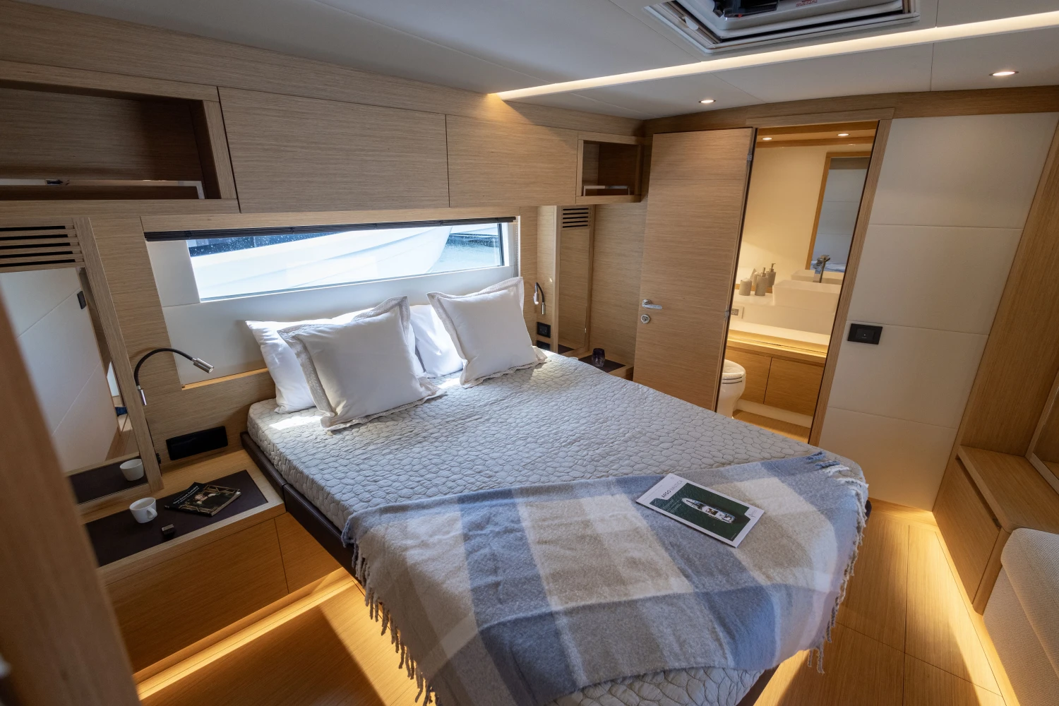 An enclosed main deck provides shelter from the elements with a sliding roof and either a galley up or down option, with plenty of comfortable and stylish wrap-around seating to relax. While the spacious exterior provides sunpads and seating forward and aft, the cockpit sunpad cleverly converts to a generous U-shaped dining area giving ultimate flexibility. The lower accommodation has an owner’s double ensuite cabin, a twin cabin and an optional single cabin. Standard engines are 2 x Volvo IPS 650 with the option to upgrade to Volvo IPS 700 or 800, reaching up to 32 knots.