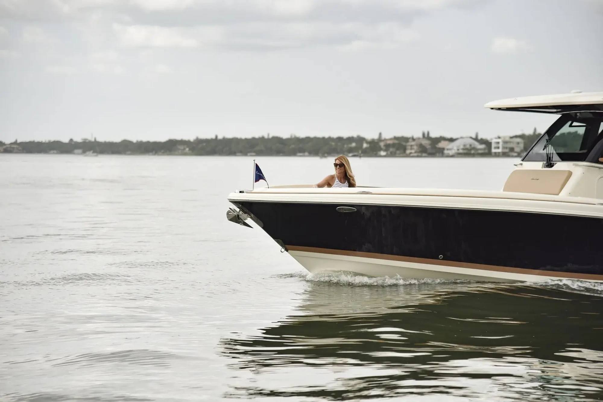 If you prefer a multi-purpose open dayboat, the Chris-Craft Launch 35 GT, is also a class leader. In fact, as the flagship of the entire Launch line, it’s so plush, so well equipped, so comfortable and so stylish that it feels like a distillation of all of the things that Chris-Craft does best. There’s a spacious heads compartment with hot and cold water beneath the port console. There’s an air-conditioned double berth beneath the starboard console. There’s a dual-screen Garmin control system, with integrated audio, a powerful subwoofer and six-zone programmable LED lighting. There are three forward-facing bow loungers, with built-in armrests and an electrically operated teak table. And in addition to inboard and outboard options, plus user-friendly joystick control, it also features a custom-crafted GT aluminium hardtop, with integrated speakers, a push-button sunshade and a powder-coated finish to match the gelcoat. It is powerful evidence, if evidence were needed, that after nearly 150 years in business, Chris-Craft continues to build some of the most seductive and desirable powerboats on the water.